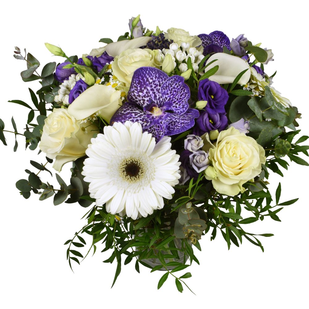 These fabulously cool lilac and blue eustoma, blue vanda partnered with white bouvardia, white gerbera and cream roses creates a fresh and uplifting display that will look gorgeous in any room.