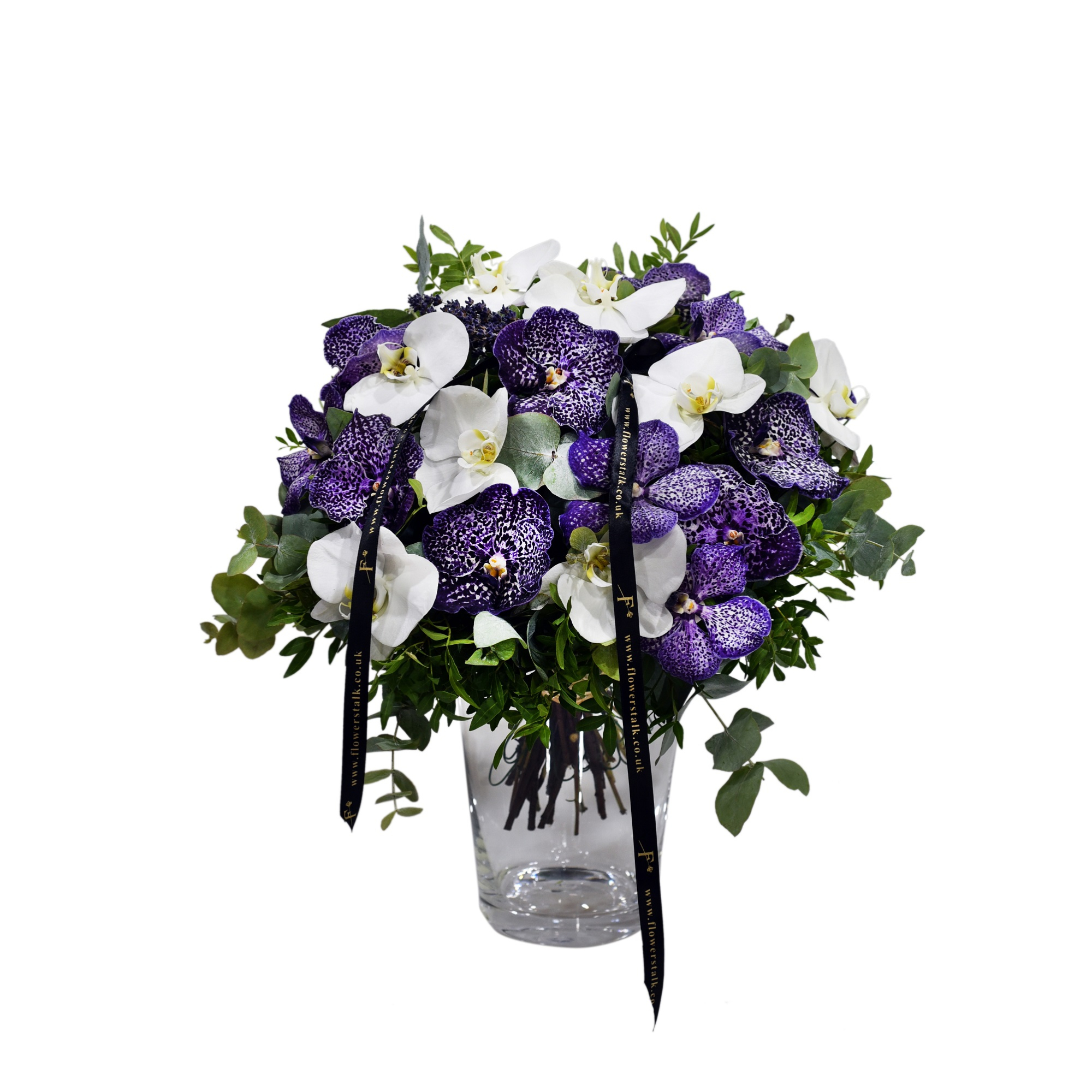 A stunning hand-tied bouquet of blue Vanda and white Phalaenopsis orchids with a little bundle of freeze-dried lavender together with fresh greenery that's so inviting to eyes. Freeze-dried lavender can be kept for several months. Vase not included but can be purchased as an option at checkout.