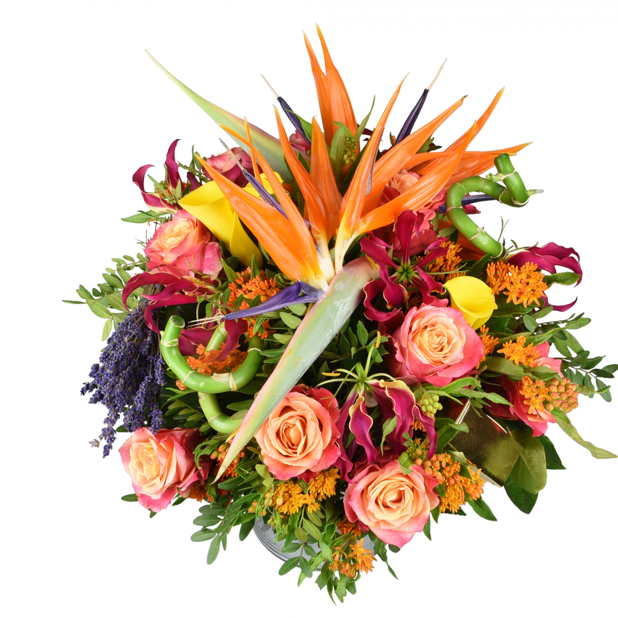 This sumptuous summer bouquet is made up of a streltizia (brids of paradise), 2 tone large headed roses, gloriosa, asclepia, zantedeschia and freeze-dried lavender together with a selection of foliage that will surely take pride of place in any room.