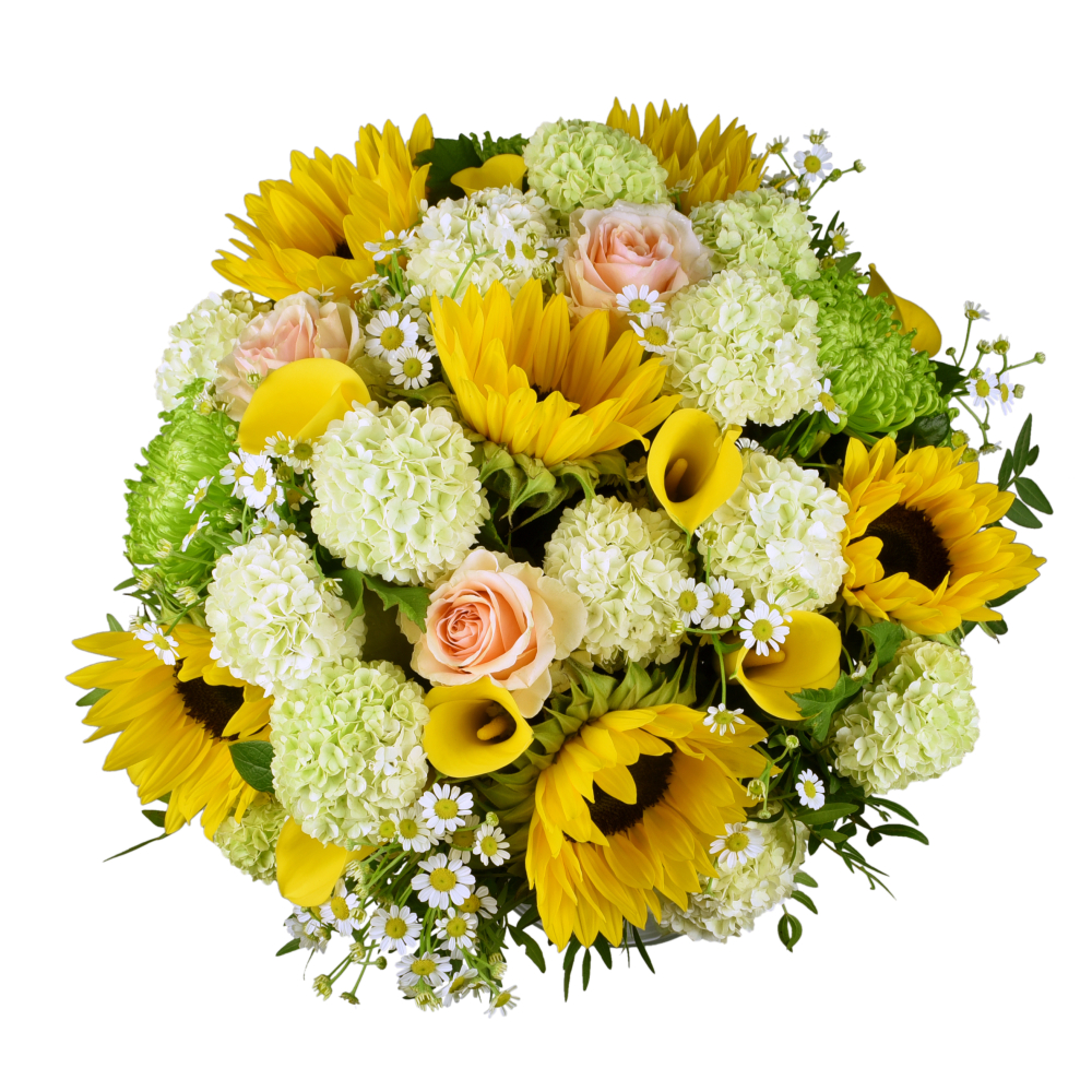 This beautiful bouquet will bring the sunshine to any room in the house. The bright hand-tied bouquet features sunflowers, zantedeschia, roses,chamomile, shamrock and viburnum finished with pistash.