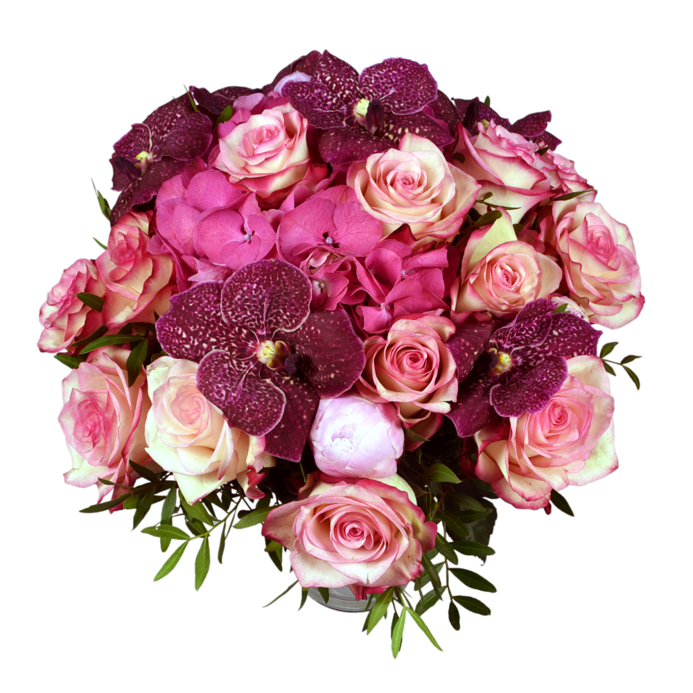 This heavenly hand-tied bouquet of luxurious large headed 2 tone roses, deep pink vanda orchid and pink hydrangea is perhaps the epitome of natural beauty. We adore these shades of pinks for their femininity and elegance. It will have pride of place in any home or office.