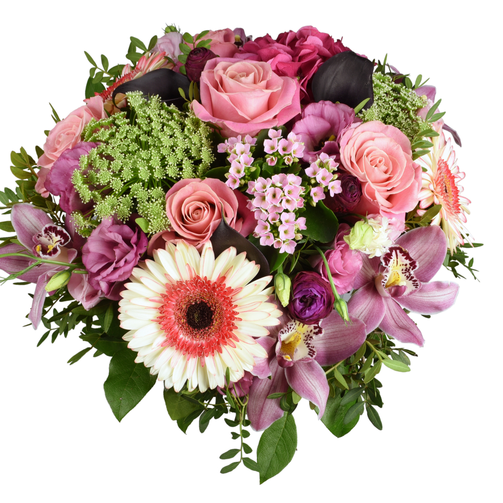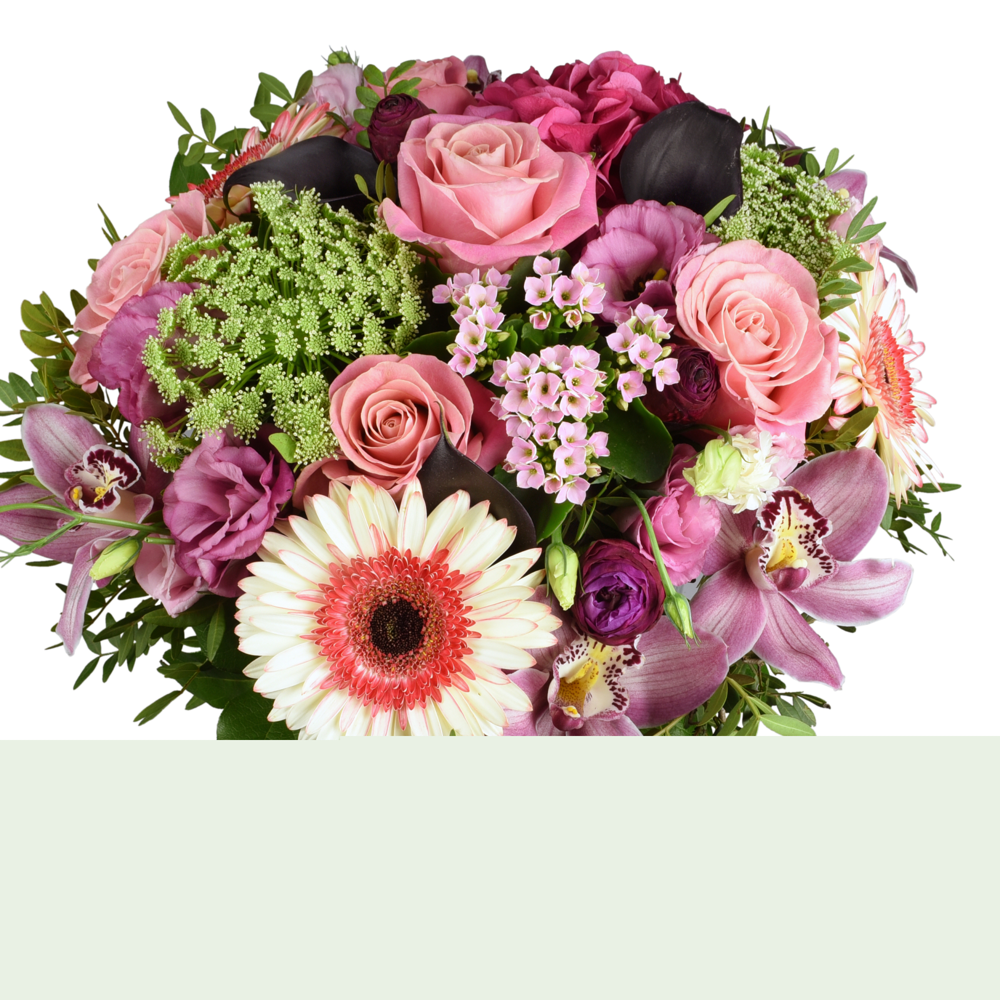 This stunning hand-tied bouquet has a chic cotemporary feel and is perfect for any occasion. Featuring large headed roses, eustoma, cymbidium orchid, gerbera, ammi and bouvardia complimented with pistash and salal tips.