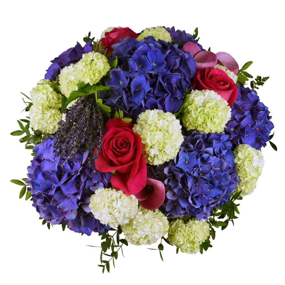 A unique combination of blue hydrangea, pink Floyd rose, green viburnum, cerise zantedeschia and freeze-dried lavender hand-tied with a selection of greenery makes this one of our favourite creations.