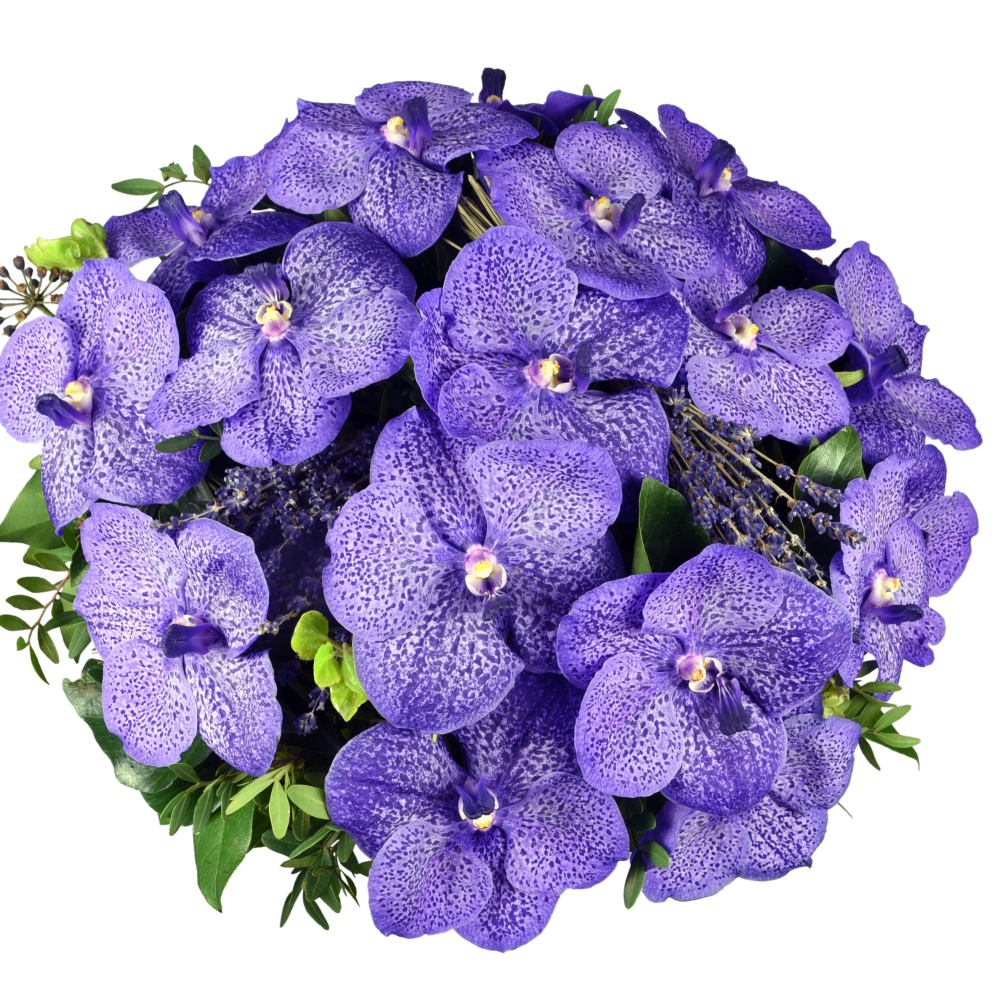 A stunning bouquet with blue vanda orchid and freeze-dried lavender, almost unreal, however nevertheless is naturally produced. A stunning gift to give or receive. Freeze-dried lavender can be kept for at least a year.