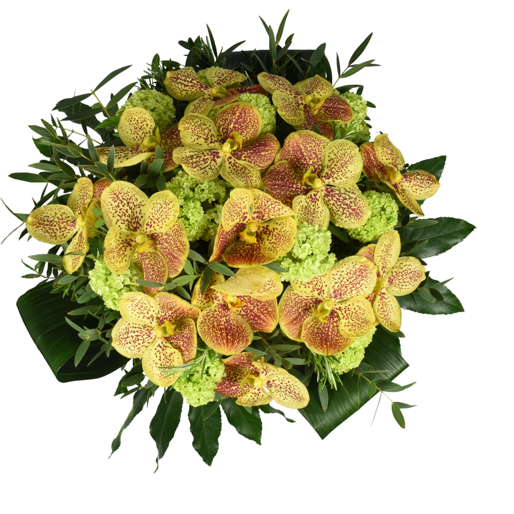 This magnificent hand-tied bouquet of the very finest premium quality vanda orchid is a luxurious choice that retails a sense of stylish informality too. If they love flowers, they're guaranteed to feel very special receiving this gift of yellow and vanda orchid and line green viburnum complimented with a selection of green foliage.